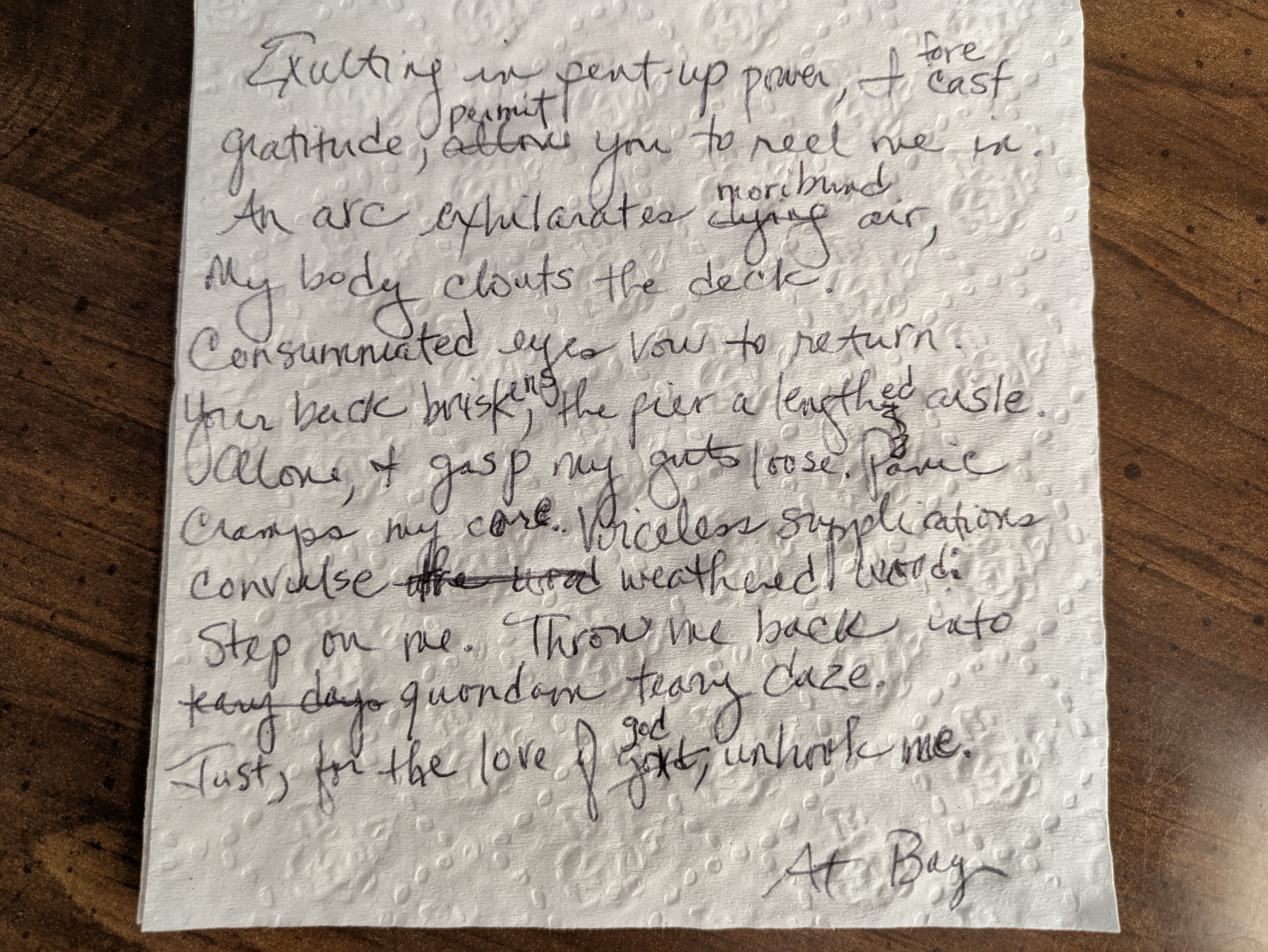 My poem “At Bay,” a part of the Napkin Poems series, guest-edited by poet Gardner Dorton, for Thirty West Publishing House‘s literary magazine and newsletter Afterimages