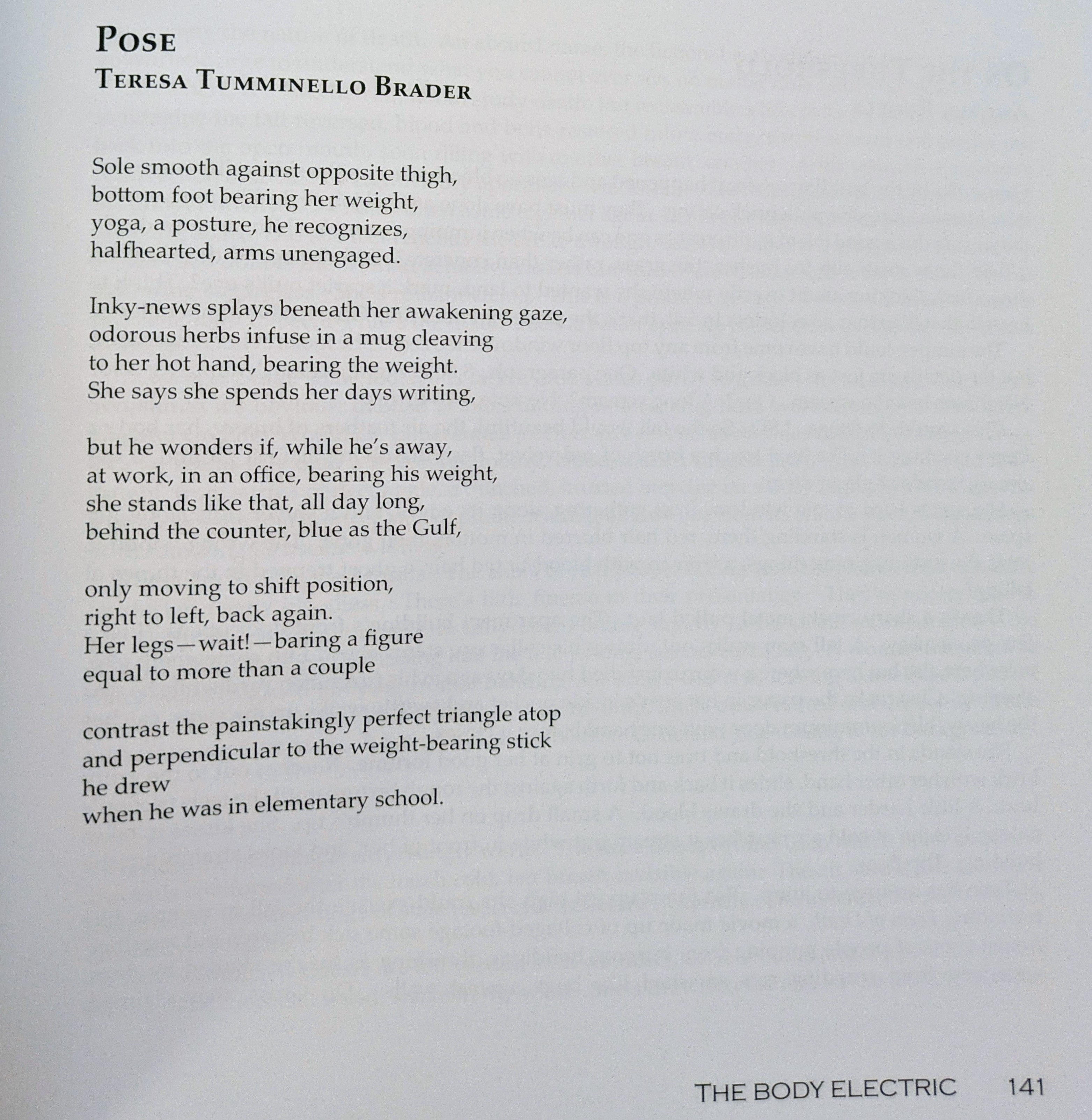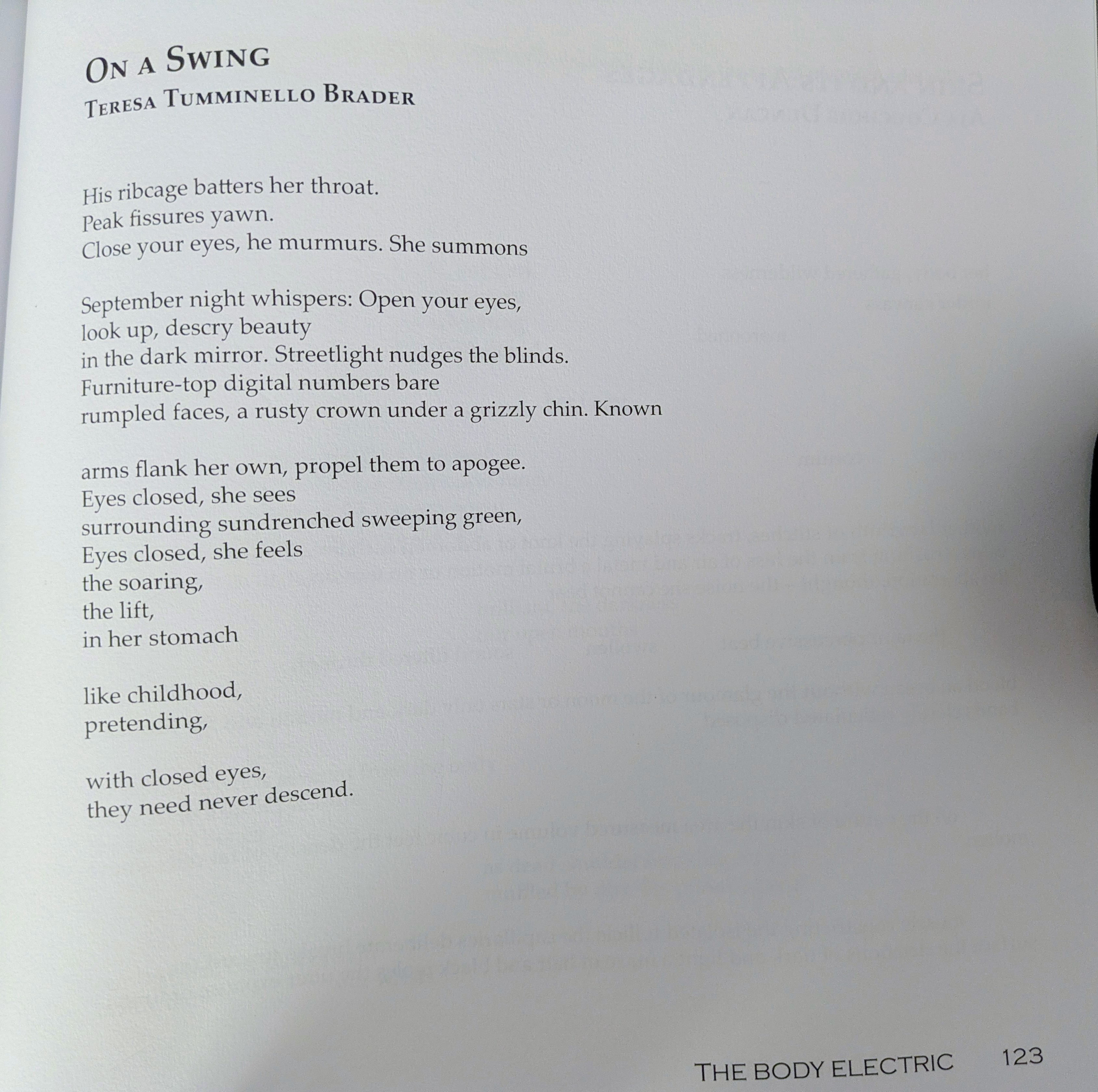 Recently I had some interest in my two poems in the anthology The Body Electric (2011), edited by Aimee Herman, no longer in print, so here they are, “On a Swing” and “Pose.” A different version of “Pose” can be found in my new short-story collection, Secret Keepers.