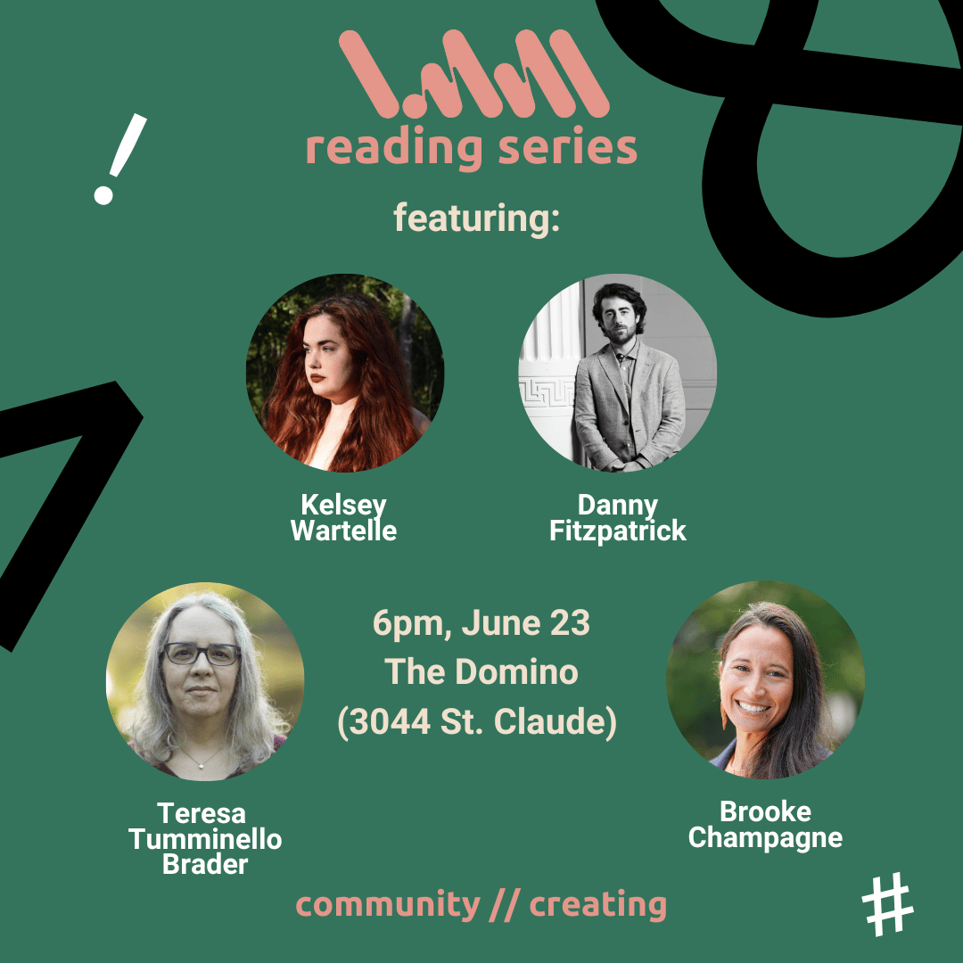 A big thank you to Nikki Ummel and Michelle Nicholson of LMNL Arts for including me in their monthly reading series, at the Domino last Sunday, June 23rd. The event was so much fun, and it was a pleasure meeting and listening to the other readers: Kelsey Wartelle, Danny Fitzgerald, and Brooke Champagne.